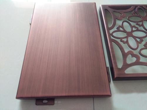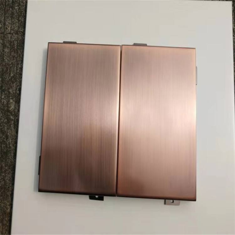 鍍銅拉絲鋁單板采用優(yōu)質(zhì)高強(qiáng)度合金鋁板,用“三涂二烤”工藝在鋁板上依次噴涂底漆、面漆、顏色漆及透明清漆,并在烘干固化后的仿銅氟碳漆表面進(jìn)行拉絲工藝處理,氟碳漆仿銅產(chǎn)品圖案具有銅的實(shí)物感、立體感,效果逼真,紋理清晰,圖紋牢固耐磨。減少采用銅板裝飾的高額成本,節(jié)約資源,提高經(jīng)濟(jì)效益。