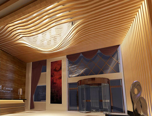 弧形鋁方通吊頂的設計,有基本的兩點要求,一個是底寬的要求,另一個是厚度的基本要求。兩者都是因為加工工藝的限制從而受到限制,波浪造型鋁方通吊頂的底寬,一般建議在30mm以上,小30mm,因為波浪造型鋁方通吊頂,是通過電焊固定成型的,電焊的過程中,需要保證整個鋁方通的平直度,如果底寬太小,電焊加工的過程中很容易造成歪曲,從而影響整根鋁方通的效果,其次,厚度的基本要求,是因為波浪造型鋁方通吊頂燒焊加工而成,燒焊的焊點比較多,溫度較高,如果是太薄的板子,一燒焊就穿了,這樣自然是加工不了的,因而波浪造型鋁方通吊頂厚度要求在2.0mm以上